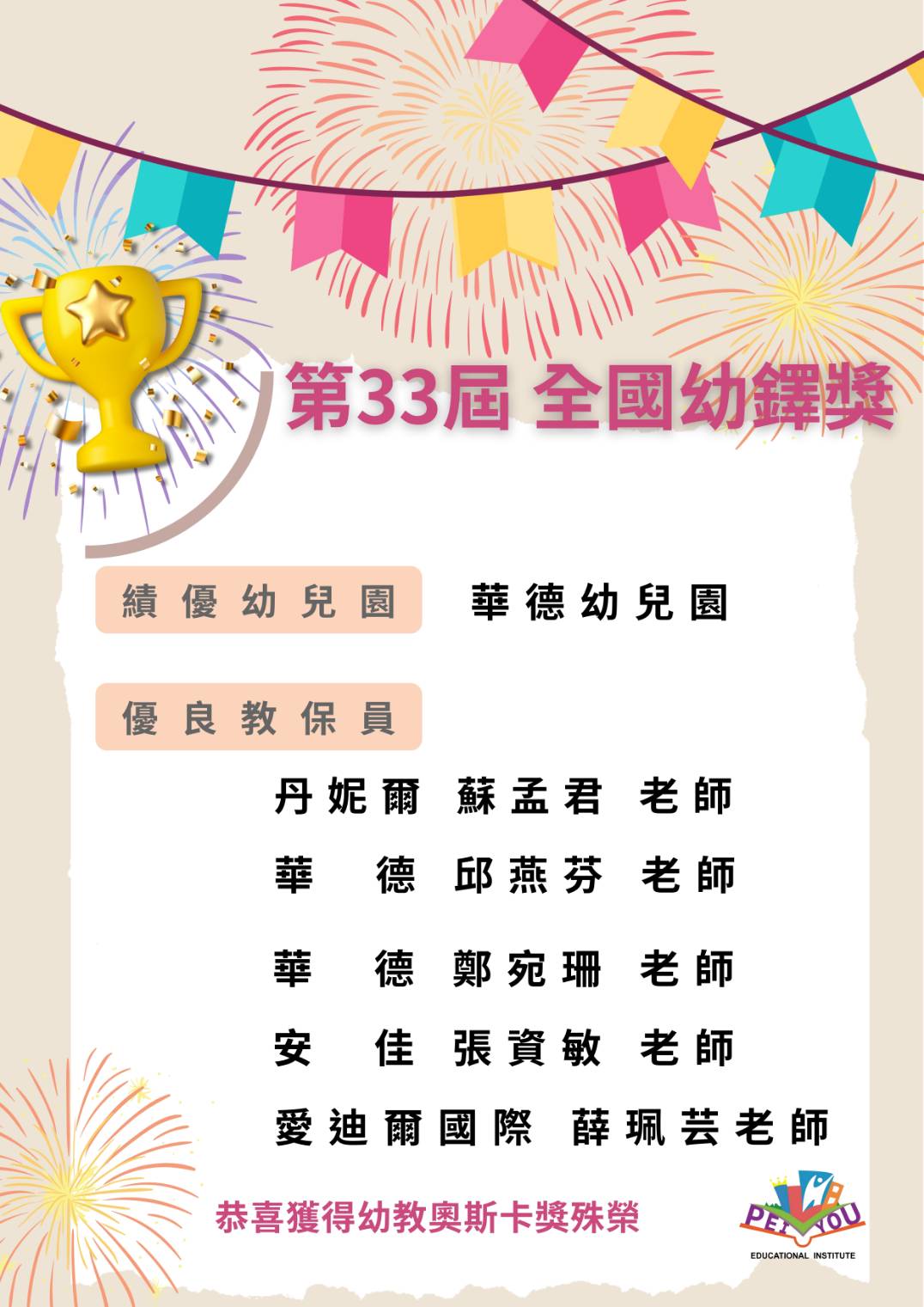 我們滿心喜悅地和大家分享一個令人振奮的好消息!在第33屆全國幼獎中,華德幼兒園榮獲「績優幼兒園」殊榮!同時,也有多位老師憑藉著專業與愛心,榮獲「優良教保員」的肯定。🎉