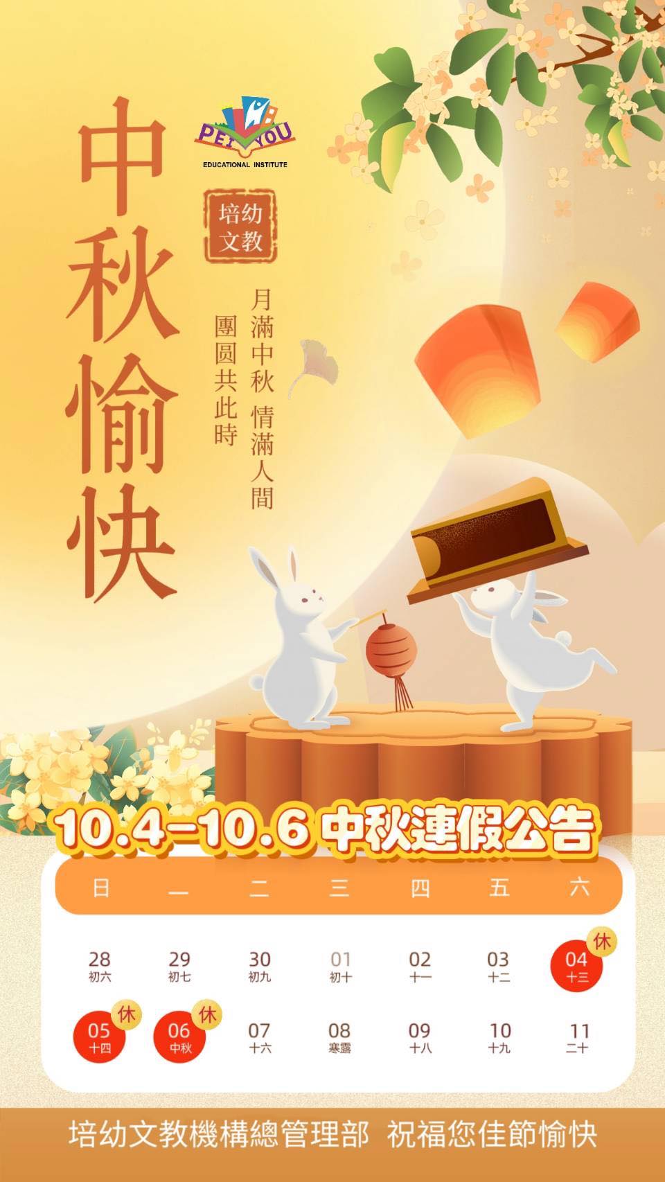 月圓人團圓,溫馨的中秋佳節即將到來,本園將配合國定假期於 10月4日(六)至10月6日(一)放假三天,10月7日(二)恢復正常上課。請家長們特別留意放假與返園時間,並妥善安排孩子的生活與作息。