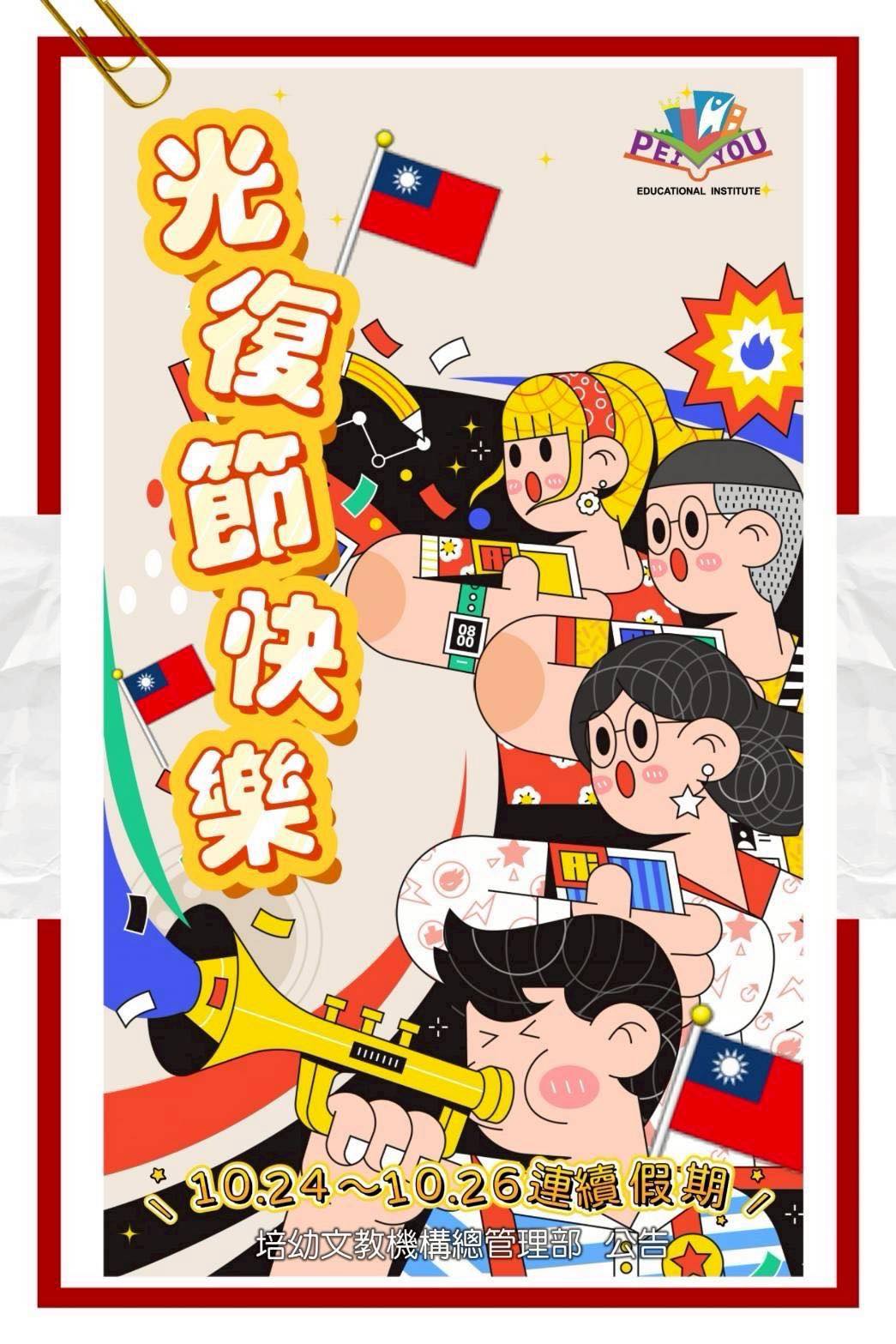 親愛的合作夥伴您好:配合國定假期,10月24日(五)至10月26日(日)放假三天,10月27日(一)恢復正常上課。請家長們提前安排好孩子的生活與照顧事宜,並留意返園時間。光復節是台灣重要的歷史節日,象徵自由與和平的珍貴。老師們也會在課程中透過故事與活動,讓孩子以生動有趣的方式認識節日意義,從中學習感恩與愛護這片土地。感謝家長的支持與配合,祝大家光復節快樂、闔家平安、假期愉快!
