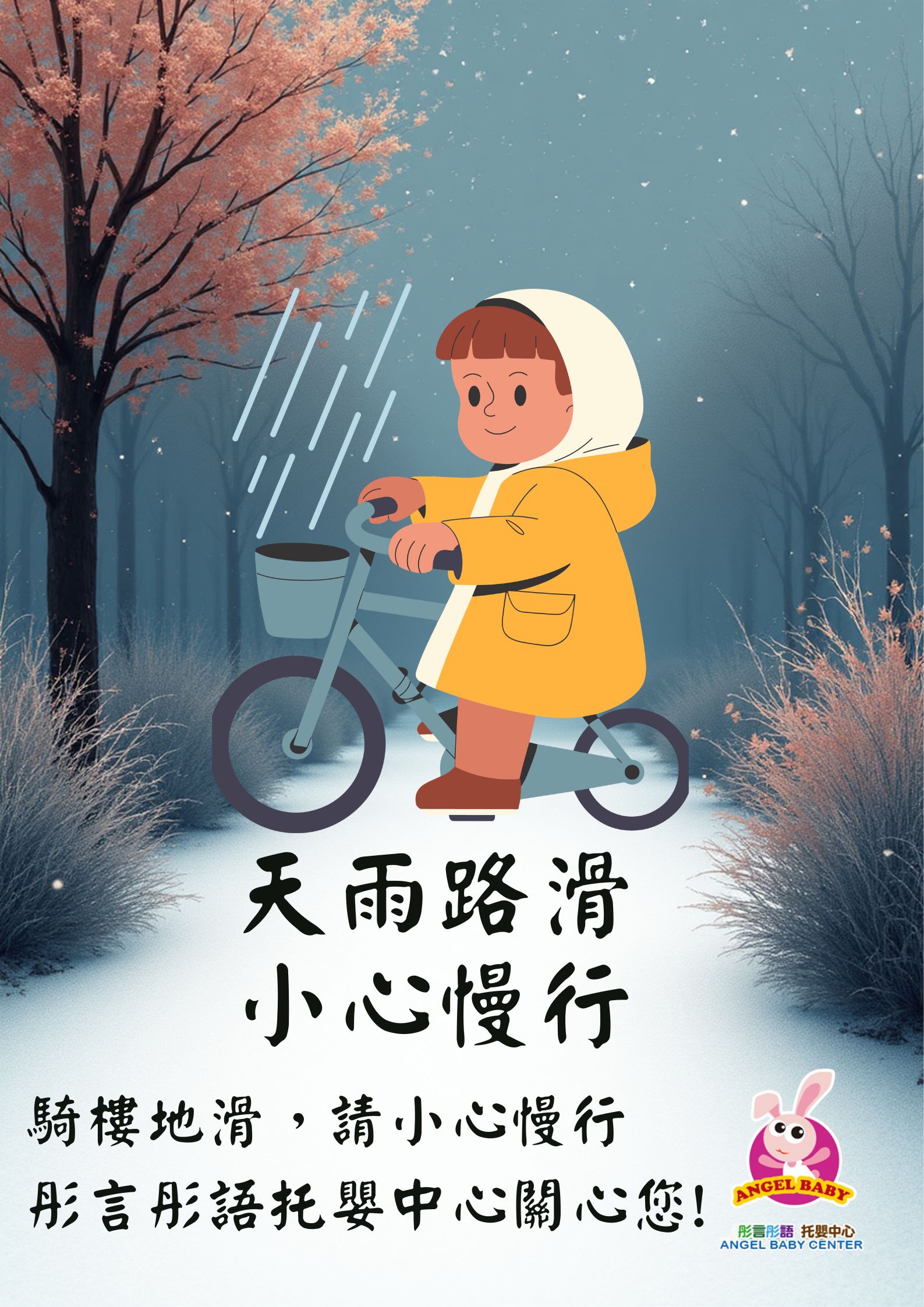 老師想溫柔地提醒大家,下雨天撐著傘、牽著寶貝的小手,行走時放慢速度,留意地面狀況;騎車或開車接送時,也請減速慢行,讓每一次出門與回家,都能平安順利。